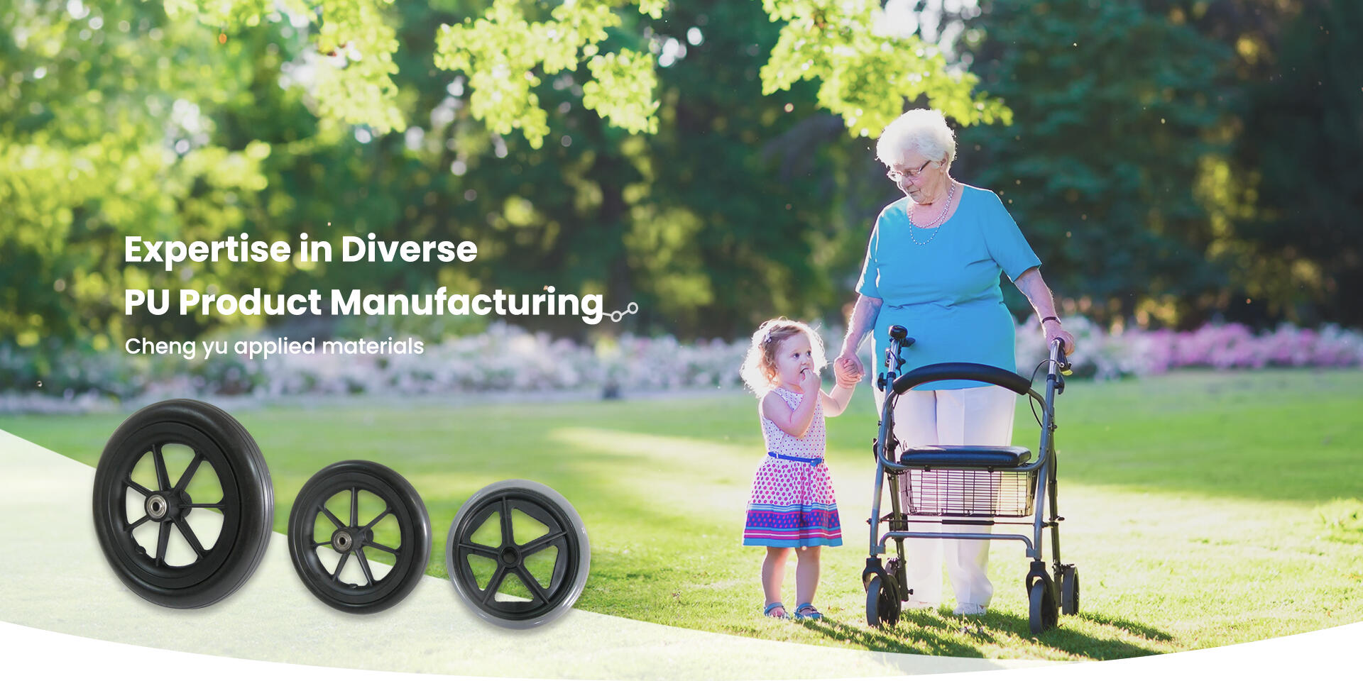Cheng-Yu Applied Materials is a professional PU tire manufacturer based in Taiwan. We specialize in producing polyurethane (PU) products, including PU foaming wheels for mobility aids, general wheelchairs, electric wheelchairs, and trolleys. Our product lineup also includes PU filling wheels, solid wheels, PU armrests, and more. As an experienced walker wheel manufacturer, Cheng-Yu also provides expert product development, customization, OEM, ODM, and full manufacturing services tailored to customers' requirements.